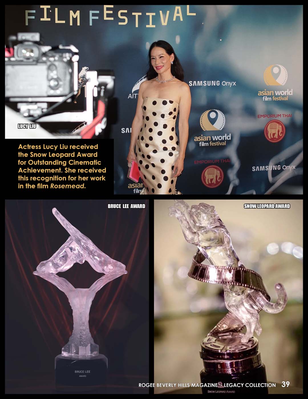 Actress Lucy Liu received the Snow Leopard Award for Outstanding Cinematic Achievement at the 11th Asian World Film Festival in Culver City in November 2025. She received this recognition for her work in the film Rosemead.