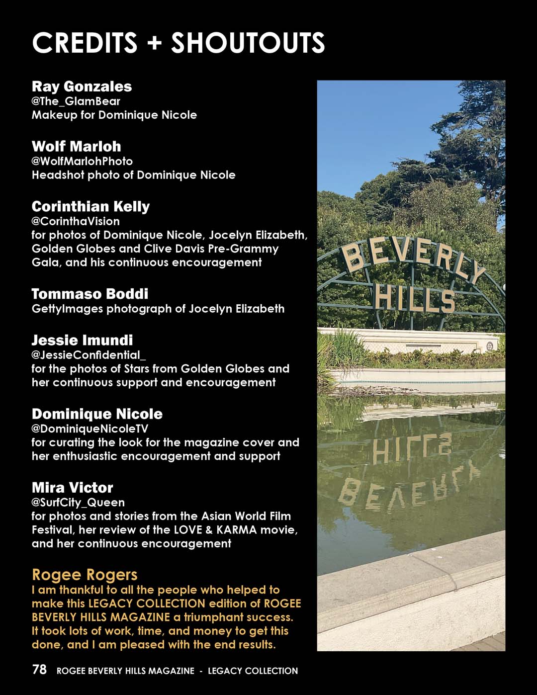 I am thankful to all the people who helped to make this LEGACY COLLECTION edition of ROGEE BEVERLY HILLS MAGAZINE a triumphant success. It took lots of work, time, and money to get this done, and I am pleased with the end results.