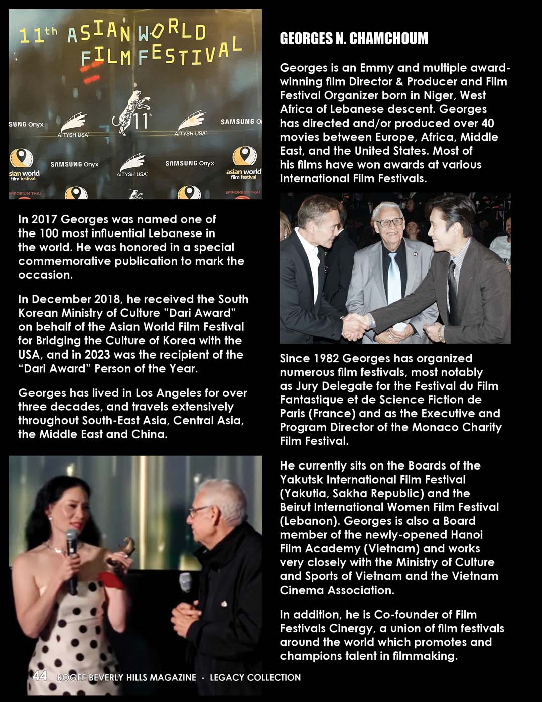 He currently sits on the Boards of the Yakutsk International Film Festival (Yakutia, Sakha Republic) and the Beirut International Women Film Festival (Lebanon). Georges is also a Board member of the newly-opened Hanoi Film Academy (Vietnam) and works very closely with the Ministry of Culture and Sports of Vietnam and the Vietnam Cinema Association.
