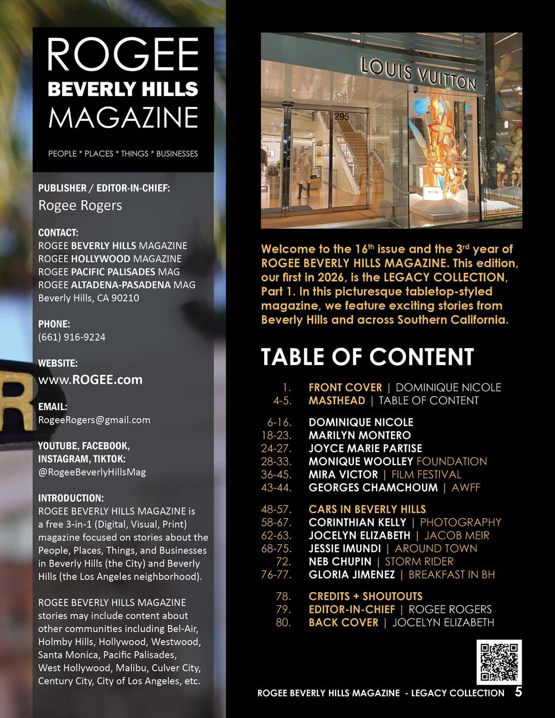 Welcome to the 16th issue and the 3rd year of ROGEE BEVERLY HILLS MAGAZINE. This edition, our first in 2026, is the LEGACY COLLECTION, Part 1. In this picturesque tabletop-styled magazine, we feature exciting stories from Beverly Hills and across Southern California.ROGEE BEVERLY HILLS MAGAZINE is a free 3-in-1 (Digital, Visual, Print) magazine focused on stories about the People, Places, Things, and Businesses in Beverly Hills (the City) and Beverly Hills (the Los Angeles neighborhood). ROGEE BEVERLY HILLS MAGAZINE stories may include content about other communities including Bel-Air, Holmby Hills, Hollywood, Westwood, Santa Monica, Pacific Palisades, West Hollywood, Malibu, Culver City, Century City, City of Los Angeles, etc.