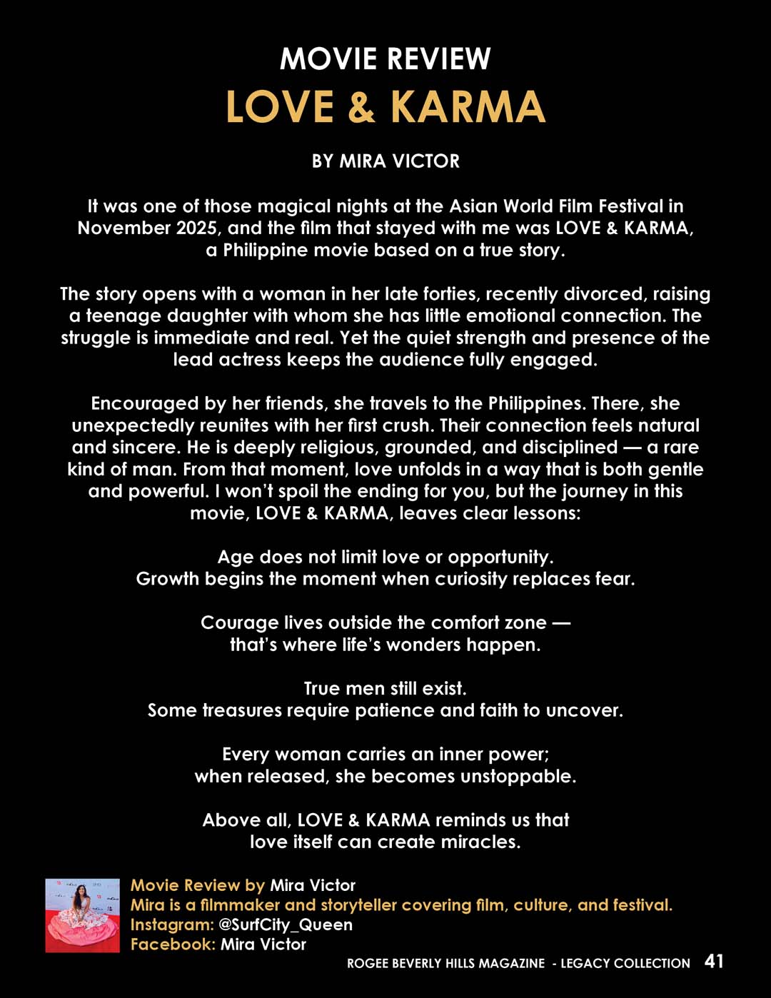 BY MIRA VICTORIt was one of those magical nights at the Asian World Film Festival in November 2025, and the film that stayed with me was LOVE & KARMA, a Philippine movie based on a true story.